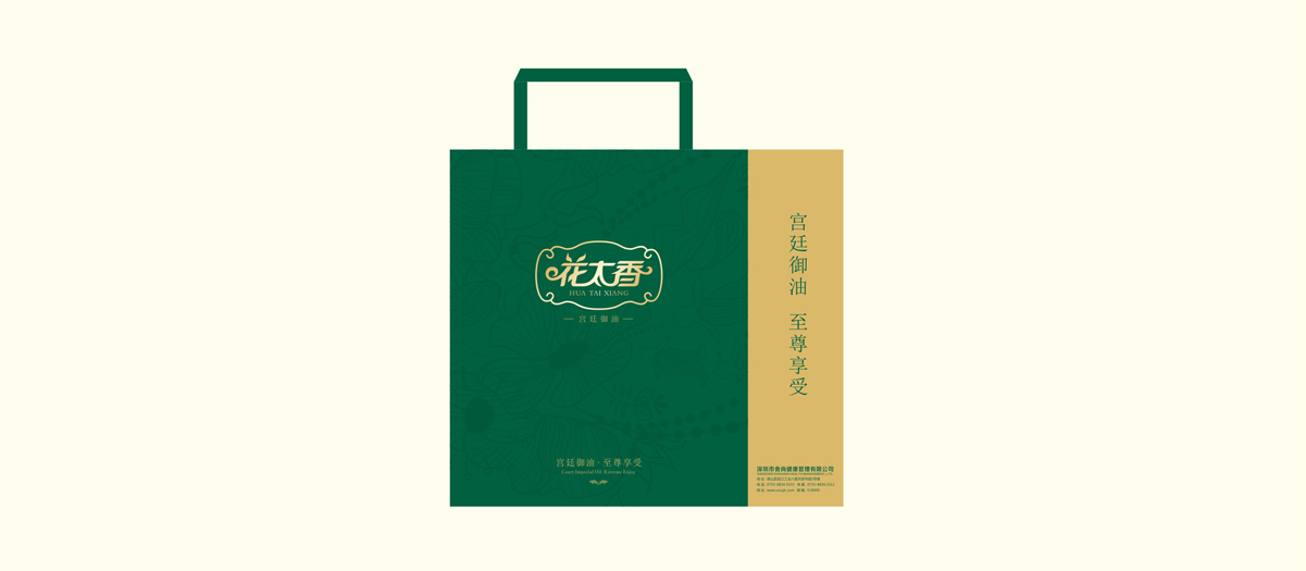據(jù)“花太香”打造的是一個100%純天然植物油的將健康理念,智恩在包裝設(shè)計上,采用綠色與金黃作為包裝設(shè)計的主色調(diào),體現(xiàn)宮廷御油的高貴, 其次綠色又是一種健康的色調(diào),并將這一理念沿用到之后的VIS設(shè)計理念中,如標(biāo)簽設(shè)計、終端設(shè)計、VIP卡設(shè)計。